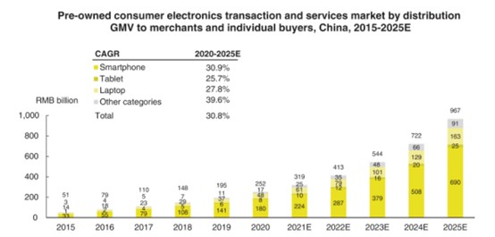 然而,就目前而言,中国市场二手手机渗透率与欧美日韩相比仍然非常低。CIC报告显示,中国的二手消费电子交易和服务是一个分散的市场,拥有大量线下小规模商户。2020年,前5名公司在向商家和消费者分销GMV方面的市场份额合计为11.9%,在与商家和消费者交易的设备总数方面占13.0%,因此,整个赛道未来依然蕴含极大的增长前景。