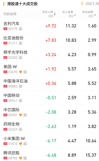 个股方面,今日南下资金净买入吉利汽车9.72亿港元,为今日买入之最。此外,南下资金净买入比亚迪股份7.83亿港元,净买入舜宇光学科技3.24亿港元。