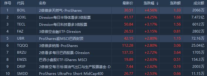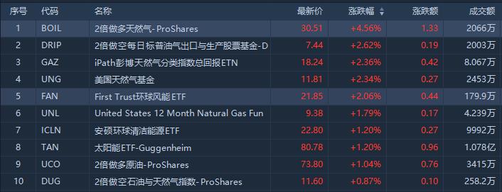 涨幅居前的有2倍做多天然的BOIL涨4.56%,成交额2066万美元;2倍做多原油的UCO涨1.04%,成交额3415万美元。