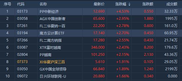 今日涨幅位居前的ETF有PP中新经济ETF涨4.53%;中国创新者ETF涨2.95%,成交额1995万港元;此外,还有南方云计算ETF涨2.70%,该ETF从5月初上市至今,累计涨超10%。