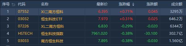 看空恒指相关ETF走强,其中南方两倍做空恒科(07552.HK)涨0.71%,成交额3295万港元。
