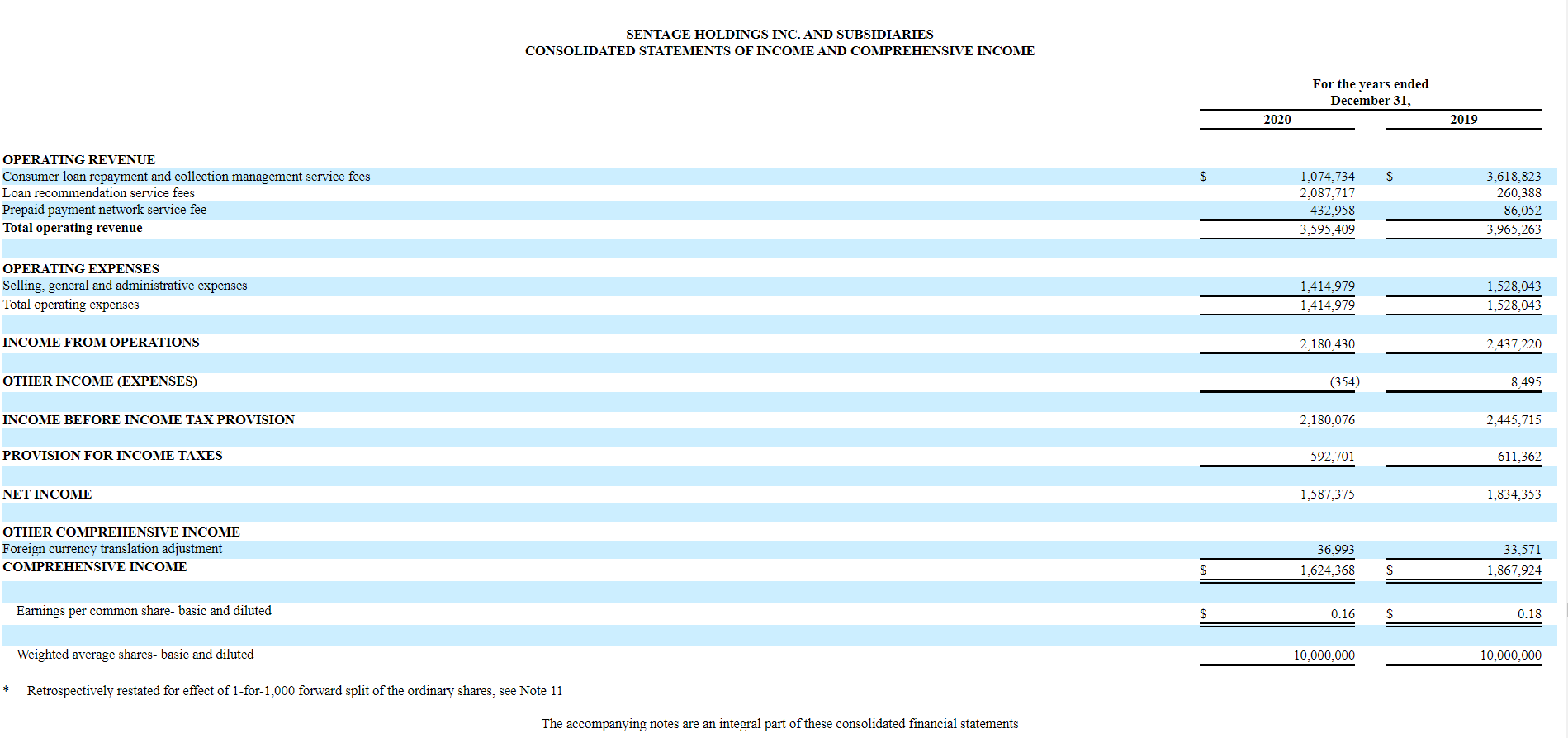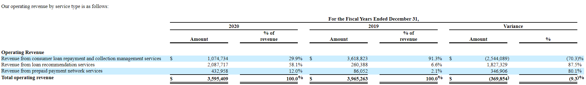 公司的主要营收来源为消费贷款还款和收款管理和贷款推荐服务。2020年、2019年来自消费贷款还款和收款管理的营收分别为107.47万美元、361.88万美元,分别占总营收的29.9%、91.3%。同期,来自贷款推荐服务的营收分别为208.77万美元、26.04万美元,分别占总营收的58.1%、6.6%。