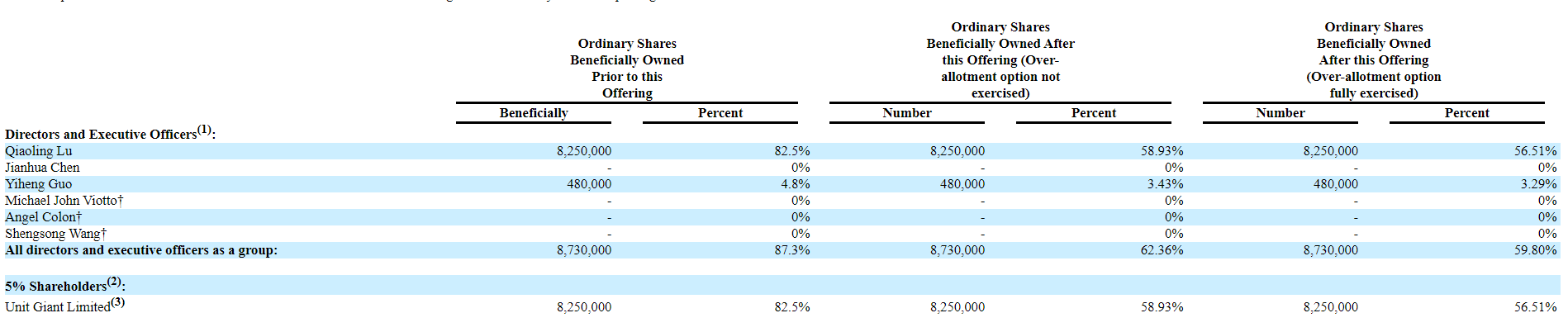 IPO前,叁腾科技首席执行官兼董事长Qiaoling Lu持股比例为82.5%,董事Yiheng Guo持股比例为4.8%。IPO后(未行使超额配售权),Qiaoling Lu持股比例为58.93%,董事Yiheng Guo持股比例为3.43%。