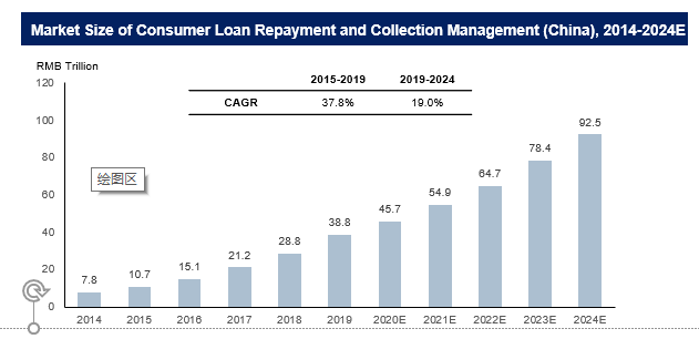 近年来,由于经济的快速增长以及互联网金融和电子商务的发展,我国的消费信贷市场有了长足的发展。 中国消费贷款还款和催收管理市场规模从2014年的78亿元人民币(约11亿美元)增长到2019年的388亿元人民币(约54.7亿美元),年复合增长率为37.8%。2019年至2024年,消费贷款还款和催收管理市场的规模预计将以19.0%的复合年增长率增长。