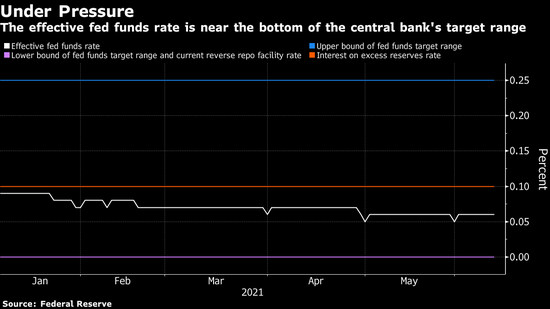 美联储目前旨在将基准利率保持在零至0.25%范围内,尽管国库券收益率和回购利率数次接近于零,甚至有时候跌至负值,但近几个月有效联邦基金利率至少比零高出5个基点,不过,美联储的资产购买计划、对纳税人的纾困款发放等因素加剧了利率下行压力。