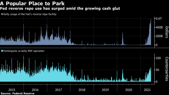 有些人想知道,如果不调整一些用来帮助引导市场的辅助利率——包括逆回购工具的零收益率,美联储可以在多长时间内遏制现金储备持续升高所带来的影响。