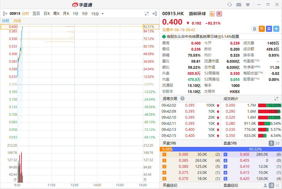 华盛资讯6月16日消息,道和环球今日连续暴涨,目前涨92.31%,报0.4港元每股,总市值6.038亿港元,两日累计涨幅超过400%。