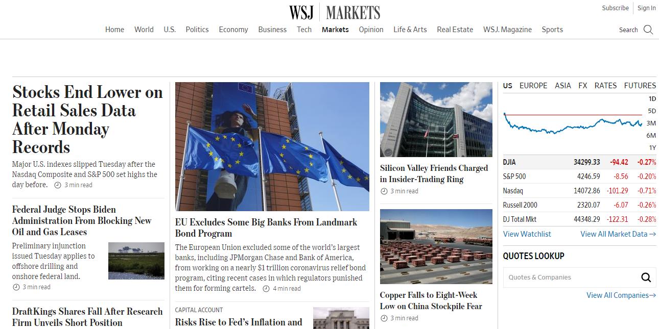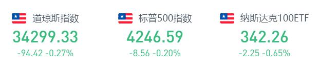 截至收盘,道琼斯指数跌94.42点,跌幅0.27%,报34299.33点;纳斯达克综合指数跌101.29点,跌幅0.71%,报14072.86点;标普500指数跌8.56点,跌幅0.2%,报4246.59点。