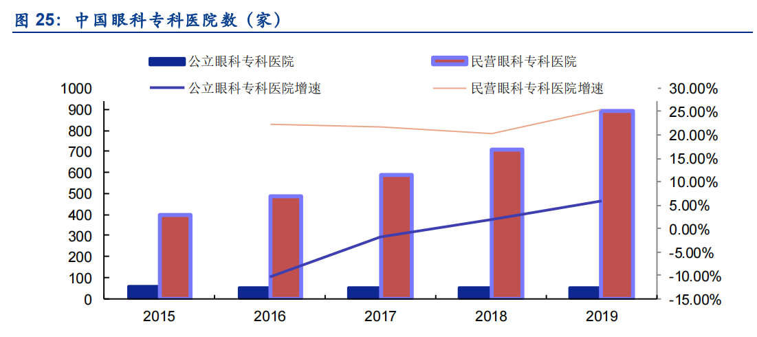 其中,民营眼科专科医院发展迅速,快速从2015年的397家增长至2019年的890家,年化复合增长率达到22.4%。