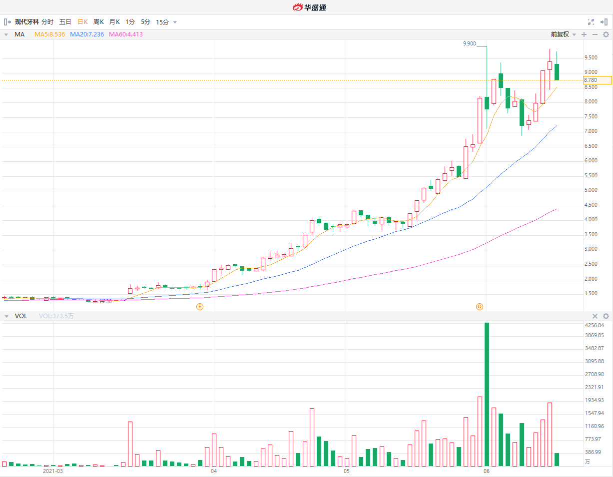 而2021年可谓是医美元年,整个医美相关概念板块都在近几个月内高歌猛进。相关的手术、针剂、医药等概念股基本上都走出了翻倍的行情,具体到各个医美项目作用的对象,也囊括了眼睛、鼻子、嘴唇、皮肤、头发等,与牙齿美容相关的标的如现代牙科(03600.HK)更是3个月内飙升6倍,风头无两。