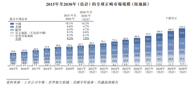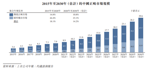 灼识咨询预计,以零售销售收入计算,中国的隐形矫治市场在整个正畸市场中的份额将由2020年的19%升至2030年的40.3%,规模达到119亿美元。