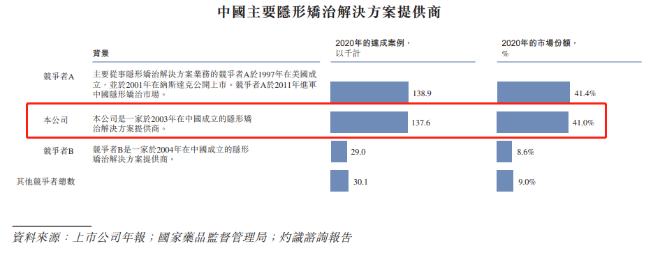 根据时代天使招股书,公司在中国隐形矫治解决方案市场中的份额占到了41%,与第一名的差距仅为0.4%,在国内竞争对手中排名第一。而根据灼识咨询的报告,时代天使是所有市场参与者中产品线最为全面的公司,意味着公司综合实力强劲。
