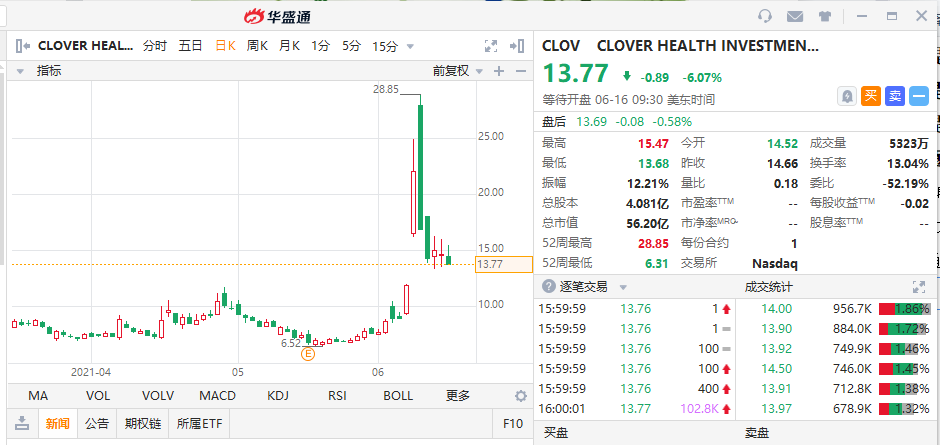 周二,美股收盘,CLOV收跌超6%,报13.77美元。