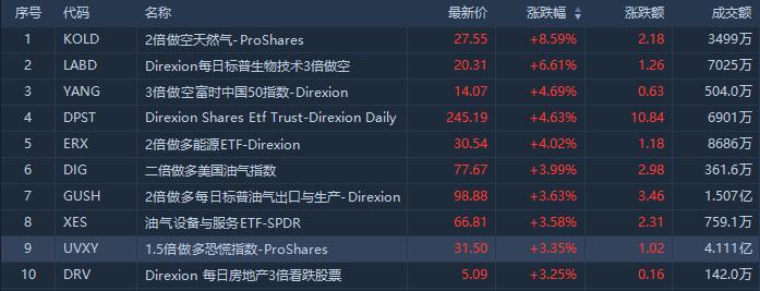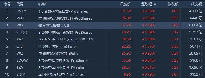 涨幅居前的有1.5倍做多恐慌指数ETF涨3.35%,成交额4.11亿美元;短期期货恐慌指数ETF涨2.26%,成交额6448万美元。