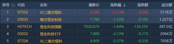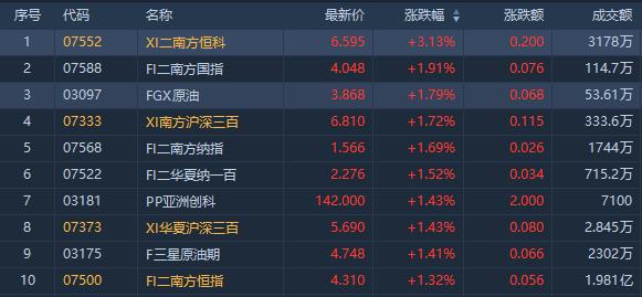 今日涨幅居前的ETF有南方两倍做空恒科ETF涨3.13%,成交额3178万港元;南方两倍看空国指ETF涨1.91%;