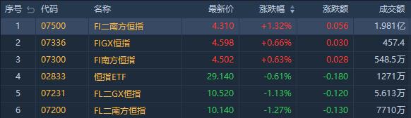 今日港股涨幅居前的恒指ETF有南方两倍看空恒指(07500.HK)涨1.32%,成交额1.98亿港元;