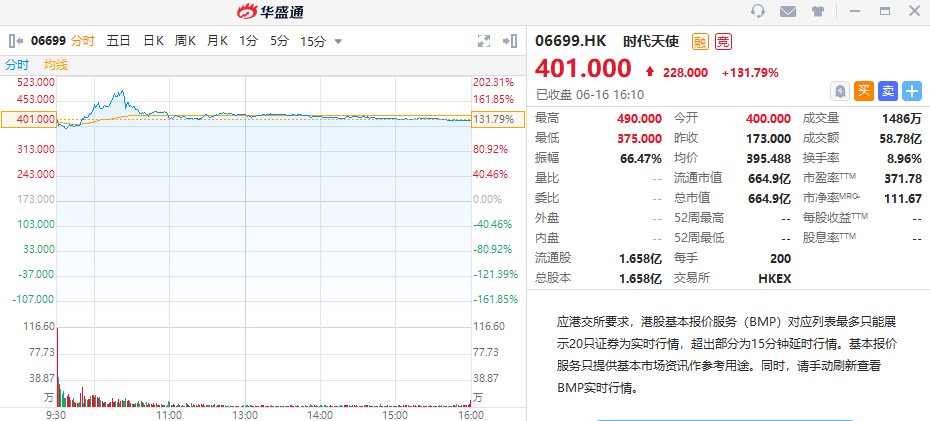 华盛资讯6月16日讯,国内隐形矫治龙头-时代天使(06699.HK)首挂收报401.0港元,较发行价173.00港元暴涨131.79%,一手账面浮盈45600港元;全日成交额58.78亿港元,最新总市值达664.9亿港元。