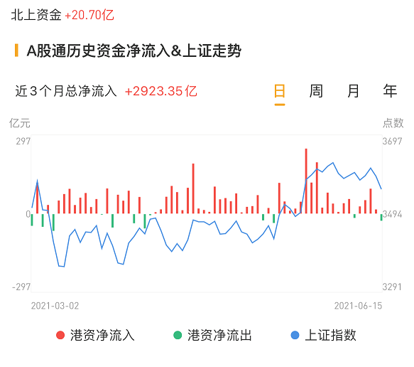 北上资金今日净流入20.7亿元,周二为净流入超25亿元。