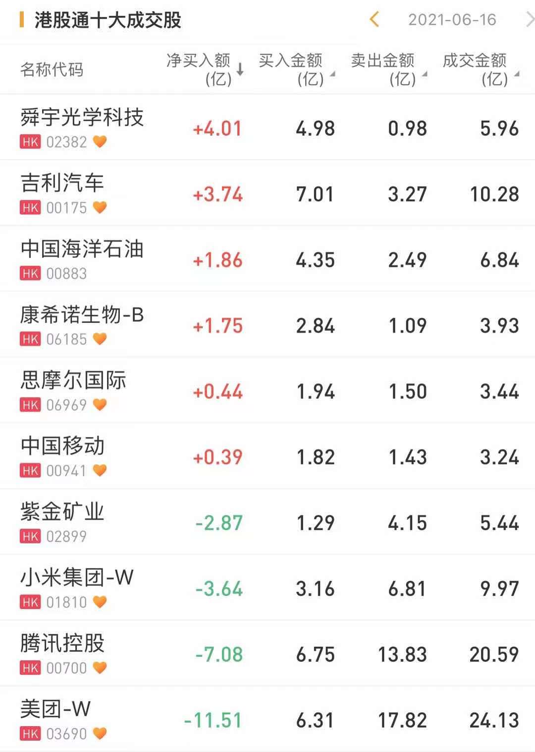 个股方面,今日南下资金净买入舜宇光学4.01亿港元,为今日买入之最。此外,南下资金净买入吉利汽车3.74亿港元,净买入中国海洋石油1.86亿港元。
