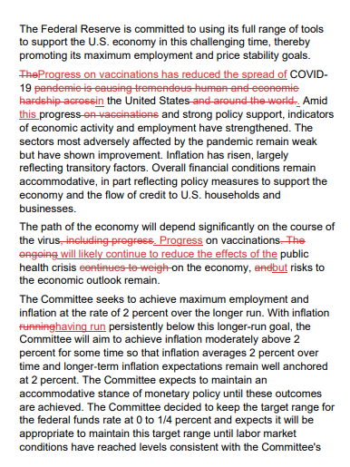 疫苗接种的进展降低了美国的新冠病毒传播(新冠疫情给美国和世界各地的人们和经济造成了巨大的困难)。随着这一进展(疫苗接种取得进展)和强有力的政策支持,经济活动和就业指标有所加强。受大流行病不利影响最大的部门仍然薄弱,但已显示出改善。通货膨胀率上升,主要反映了暂时性因素。整体金融状况保持宽松,这部分是因为支持经济的政策措施以及流向美国家庭和企业的信贷。