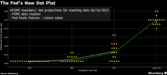 点阵图显示2023年底前料加息两次;FOMC上调未来三年通胀预测