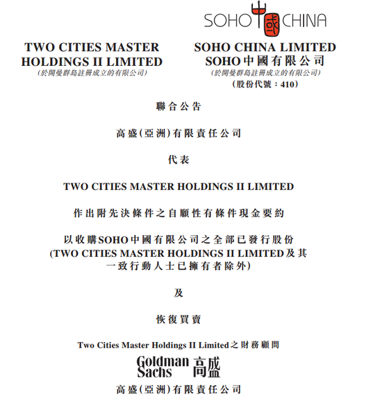“截至公告日,SOHO中国与任何第三方并未就潜在交易订立任何正式或具法律约束力的协议。”