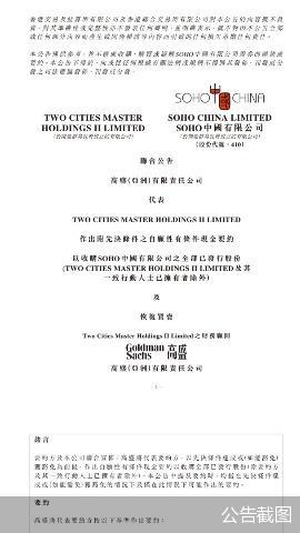继16日晚间通过官方公众号披露“黑石提交要约,投资SOHO中国”后,同日晚间,SOHO中国也在港交所发布公告称,高盛代表黑石集团以5港元/股的价格,总共收购SOHO中国约28.56亿股股份,交易价格约236.57亿港元。