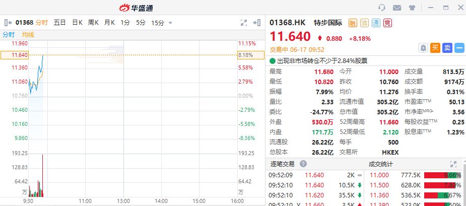 华盛资讯6月17日消息,特步国际今日持续活跃,截止发稿,特步国际上涨8.18%,现报每股11.64港元,总市值305.2亿港元,成交额9174万港元,该股三日累计涨幅超30%。