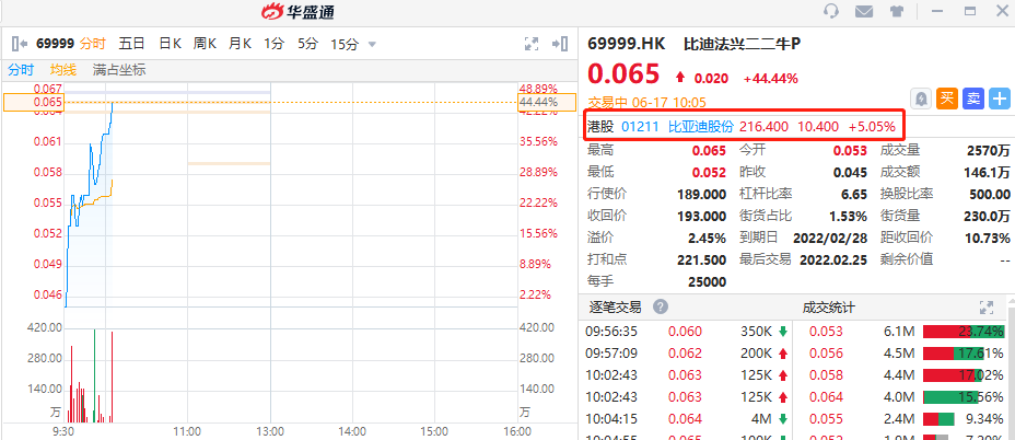相关涡轮方面,比迪法兴二二牛P涨44.44%,其行使价为189港元,到期日为2022年2月28日,距收回价10.73%。