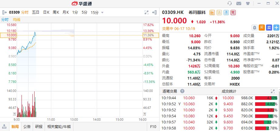 华盛资讯6月17日消息,希玛眼科连续走高,截止发稿,现涨11.36%,报每股10.00港元,总市值114.8亿港元,成交额2201万港元,换手率1.92%,值得注意的是该股连续四日累计涨超50%。