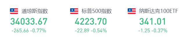 截至收盘,纳斯达克综合指数跌33.17点,跌幅0.24%,报14039.68点;道琼斯指数跌265.66点,跌幅0.77%,报34033.67点;标普500指数跌22.89点,跌幅0.54%,报4223.7点。