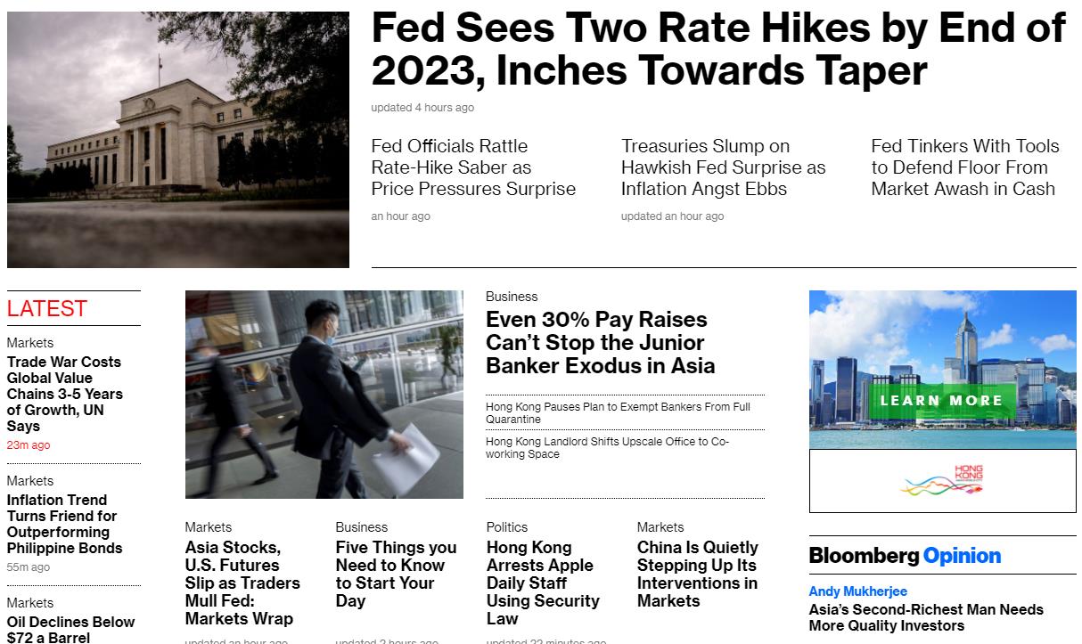 周三,美联储维持债券购买步伐不变,但大幅调升通胀指引预测,利率点阵图中位数显示,2023年底将会加息两次。在公布6月议息结果后,道指跌势加剧至超过300点,挫穿34000点关,三大股指均一度跌超1%,其后跌幅收窄。
