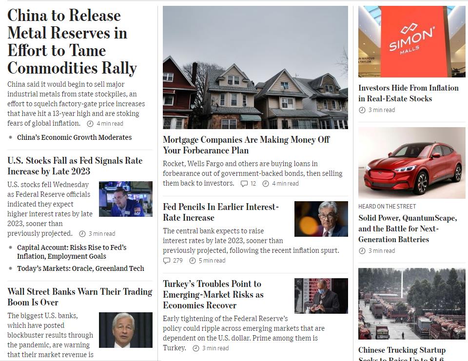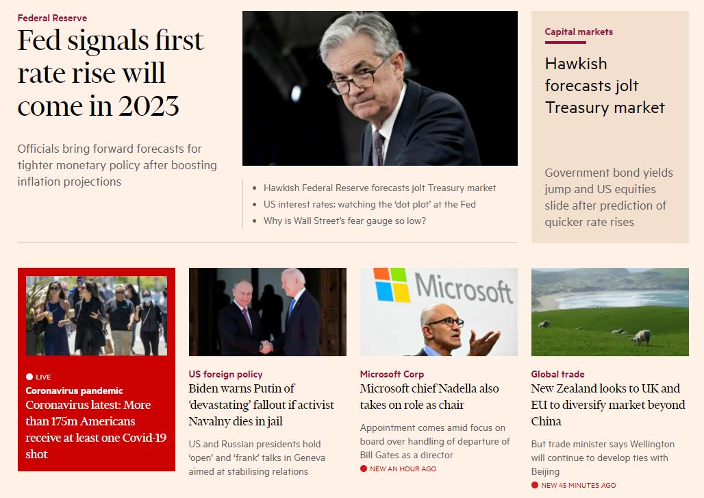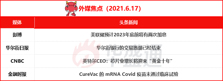 美联储宣布将基准利率维持在0%-0.25%不变,将超额准备金利率(IOER)从0.1%调整至0.15%。将继续每月增持至少800亿美元的国债和至少400亿美元的住房抵押贷款支持证券,直到委员会的充分就业和物价稳定目标取得实质性进展。点阵图显示,到2023年底,美联储将加息两次。当天发布的点阵图显示,18名美联储官员中,有13人预计基准利率将在2023年底之前至少上调一次;其中11人预计基准利率将在2023年底之前上调两次;有7人预计美联储最早将在2022年加息。这一政策转变的背后,是更强劲的经济反弹,以及高于预期的通胀水平。