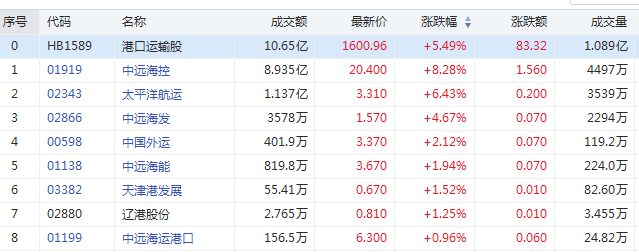 港口运输股走高 中远海控涨8%太平洋航运涨超6%