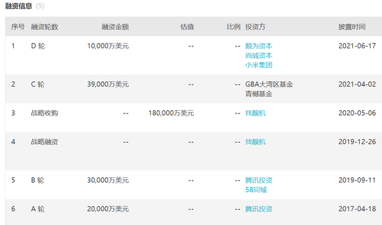 根据wind企业库,公司共有6轮融资,腾讯、找靓机多次参与投资,本次再度迎来小米集团和雷军的顺为资本投资,此外,私募股权投资基金尚珹资本也参投。
