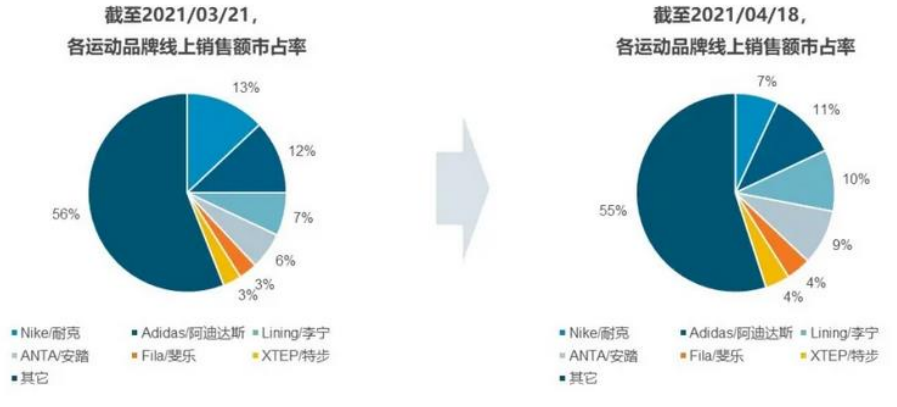 在事件发酵3周后,Nike和Adidas的线上市占率分别从13%和12%下降至7%和11%,而李宁和安踏的线上市占率分别由7%和6%上涨至10%和9%。