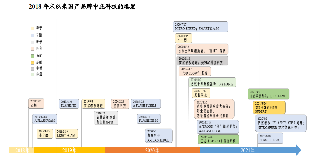 9月,搭载䨻科技,李宁推出了国内第一双全掌碳板竞速跑鞋——飞电,厚底碳板跑鞋的推出速度居于全球前列。