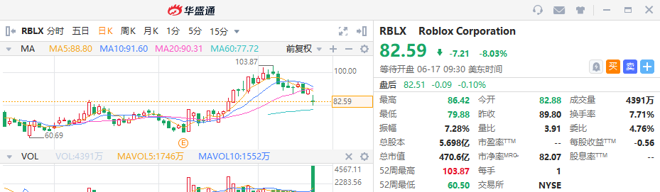 截至周三美股收盘,Roblox(RBLX)收跌8.03%,报82.59美元。