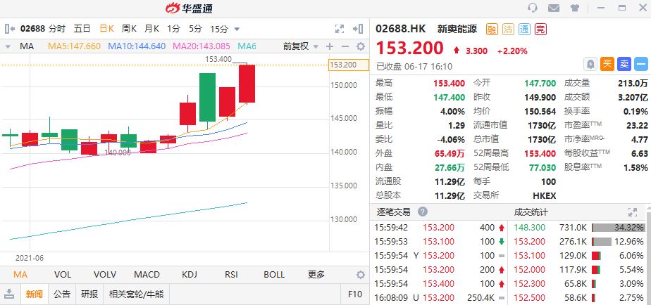 - 新奥能源是国内最大的清洁能源分销商之一,此前公司公布的2021年第一季度报告显示,公司营业收入258.5亿元,同比增长47.99%;归属于上市公司股东的净利润6.03亿元,同比增长98.48%。