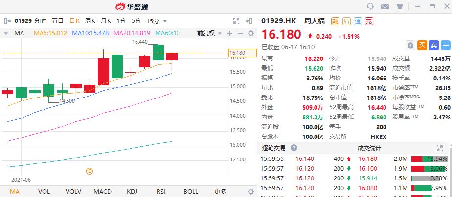 - 中金认为,周大福2021财年业绩远超预期,主要由于内地业务强势复苏以及公司费用控制良好,予周大福“增持”评级 目标价18.44港元。