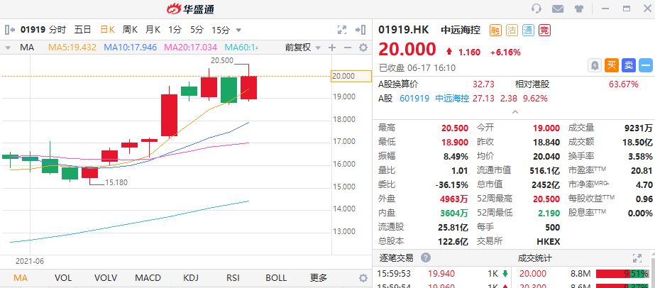 - 中信建投认为,受疫情影响,航运不畅,导致海运价格大幅飙升,随着运价的快速上涨,中远海控的业绩有望进一步攀升。6月10日,中信建投证券再度提高对中远海控的盈利预测,预计2021年净利润为775亿元,对应目标价为38元。