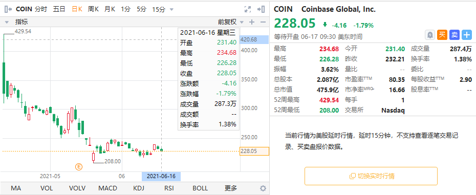 Coinbase周三收于228.05美元,比4月的发行价下跌了近9%。