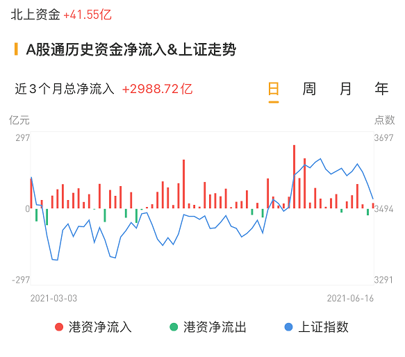 北上资金今日净流入41.55亿元,周三为净流入超20亿元。
