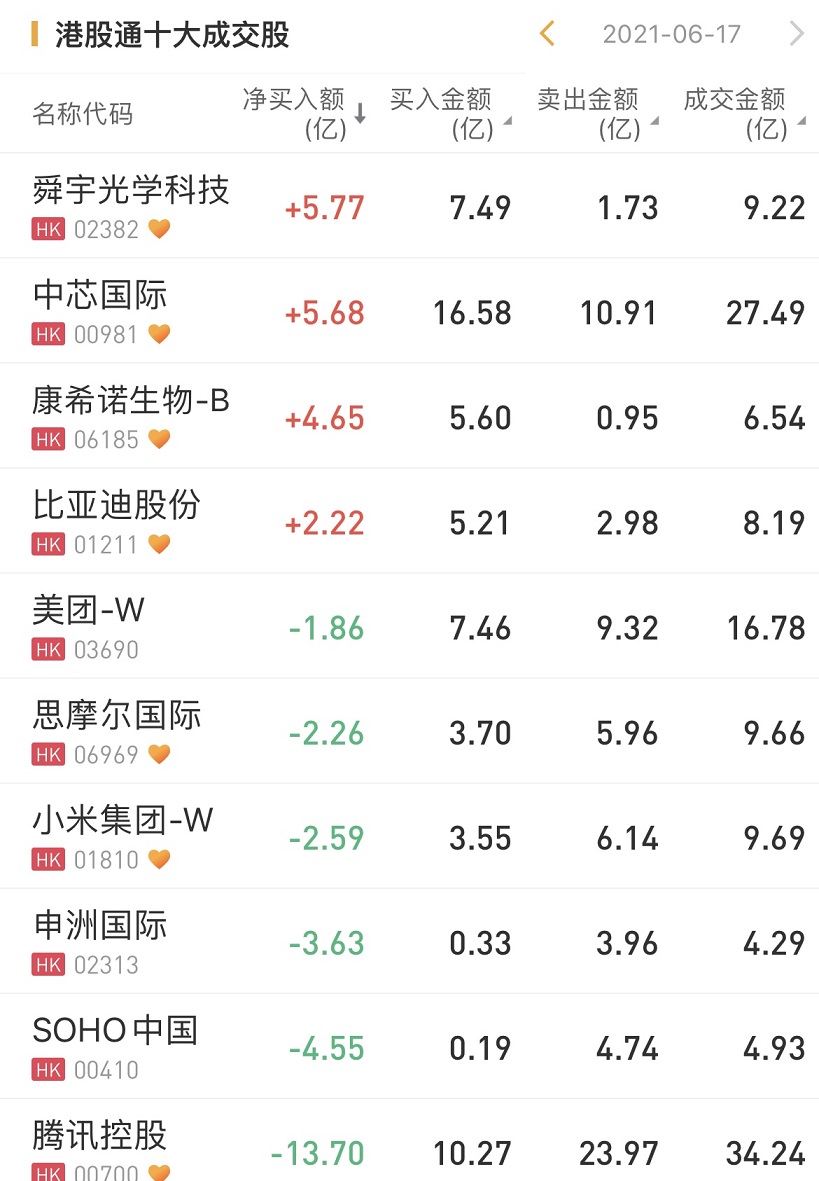 个股方面,今日南下资金净买入舜宇光学5.77亿港元,为今日买入之最。此外,南下资金净买入中芯国际5.68亿港元,净买入康希诺生物-B 4.65亿港元。