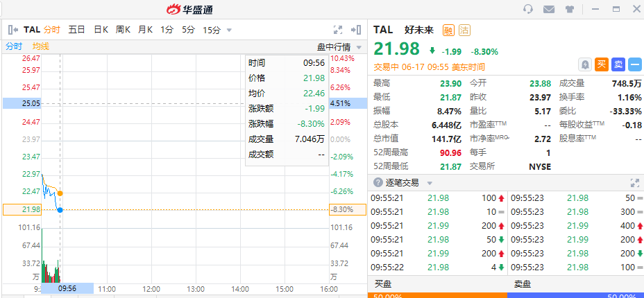 华盛资讯6月17日消息,美股早盘,中概教育股普跌。截止发稿,好未来(TAL)跌超8%,有道(DAO)跌近5%,新东方(EDU)跌超4%,一起教育科技(YQ)跌超3%。