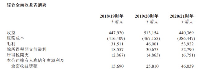 财务方面,该公司收益由2018/19财年约4.479亿港元增加14.6%至2019/20财年约5.132亿港元,随后减少至2020/21财年收益约4.404亿港元。毛利率于2018/19财年、2019/20财年、2020/21财年分别约为7.0%、9.0%、12.2%。该公司的流动资产净值由2019年3月31日约3840万港元增至2020年3月31日约6300万港元,并于2021年3月31日进一步增加至约1.094亿港元。