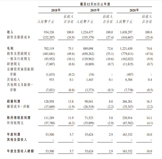 招股书显示,2018-2020年,雍禾医疗的收入分别为9.34亿元(单位:人民币,下同)、12.24亿元和16.38亿元。年度全面收入总额分别为5350万元、3562.4万元和1.63亿元。