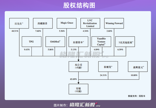 从股权结构来看,创始人汪立先生持有百心安48.51%的股权,管理约850亿美元资产的全球最大私募股权投资公司之一的TPG Capital持有9.43%股权,全球最大生物医疗领域投资机构——奥博资本(即:OrbiMed)持有百心安生物5.86%的股权,联想控股旗下的君联资本通过Magic Grace持有5.56%的股权。此外,正心谷资本、前海基金、张江科投也入股了百心安生物。