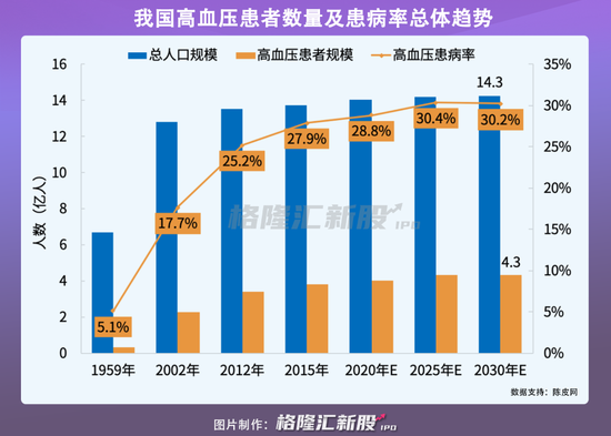 而高血压则属于心血管疾病的主要风险因素,也是病发率及死亡率的重大成因。据悉,超80%的心血管疾病患者患有高血压病。《高血压合理用药指南》显示,我国成人高血压患病率已由1959年的5.11%上升至2015年的27.9%,预计到2030年我国成人高血压患病人数将超4亿。