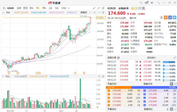 6月18日消息,安踏大涨5.56%,报174.6港元创新高,市值达4720亿港元。此前公司发布盈喜,中期经营溢利增长不少于55%。